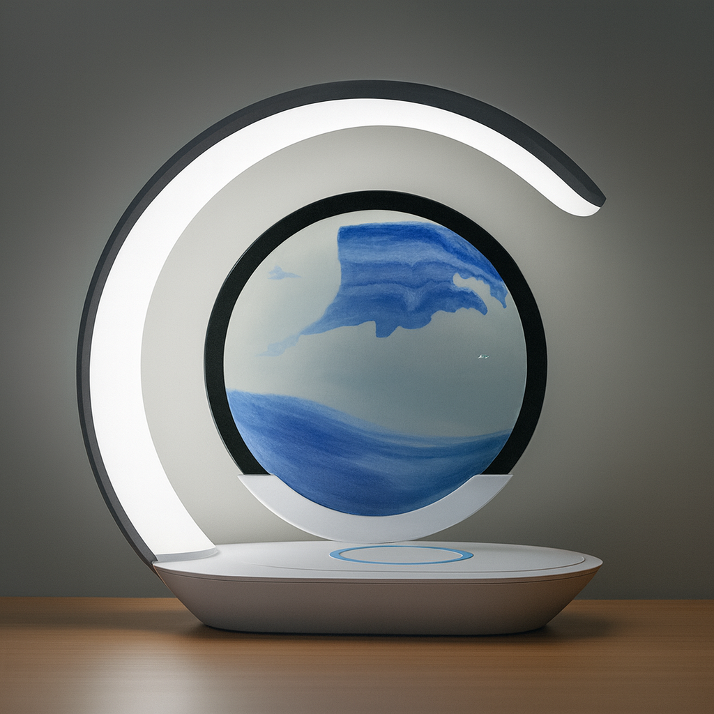 La Lampe LUMINA™ transforme n’importe quelle pièce en un espace élégant et apaisant grâce à son éclairage LED doux, son sablier circulaire en mouvement hypnotique et son chargeur sans-fil intégré pour smartphone.